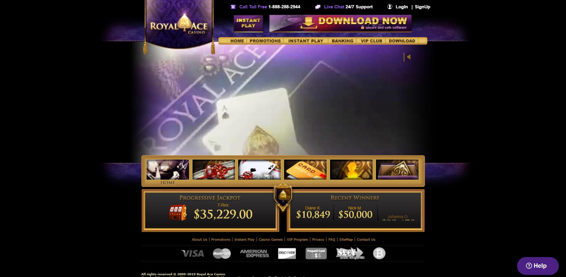 Os métodos de pagamento aceitos do Royal Ace Casino se concentram nas opções clássicas, aquelas que oferecem um maior grau de segurança, em vez de arriscar com abordagens mais modernas de transações financeiras. Por exemplo, os cartões de crédito são a opção mais popular para os usuários e para o operador do cassino. Royal Ace aceita depósitos de: